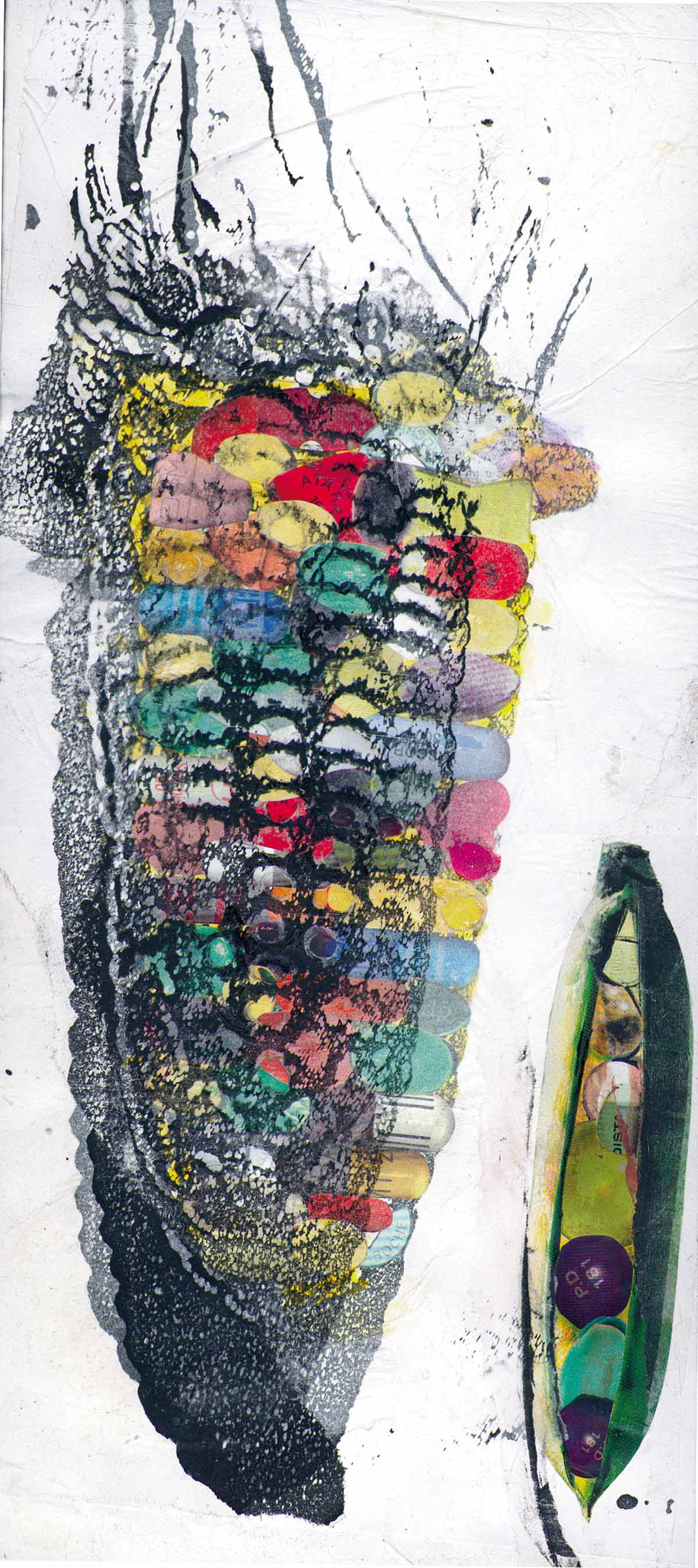 Méta Maïs Illustration, 2002, collage, impression sur papier de soie, transfert, grattage, 26 cm x 53 cm Mutation 1, 2008, H 16 cm, Ø 5 cm, maïs séché, géllules Mutation 2, 2008, H 20 cm, Ø 7 cm / argile, géllules, végétal Crédit Photo : F. Golfier Partager :FacebookPinterest